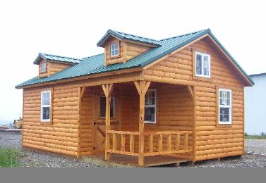 groove, half log siding. The cabin features a baked-on