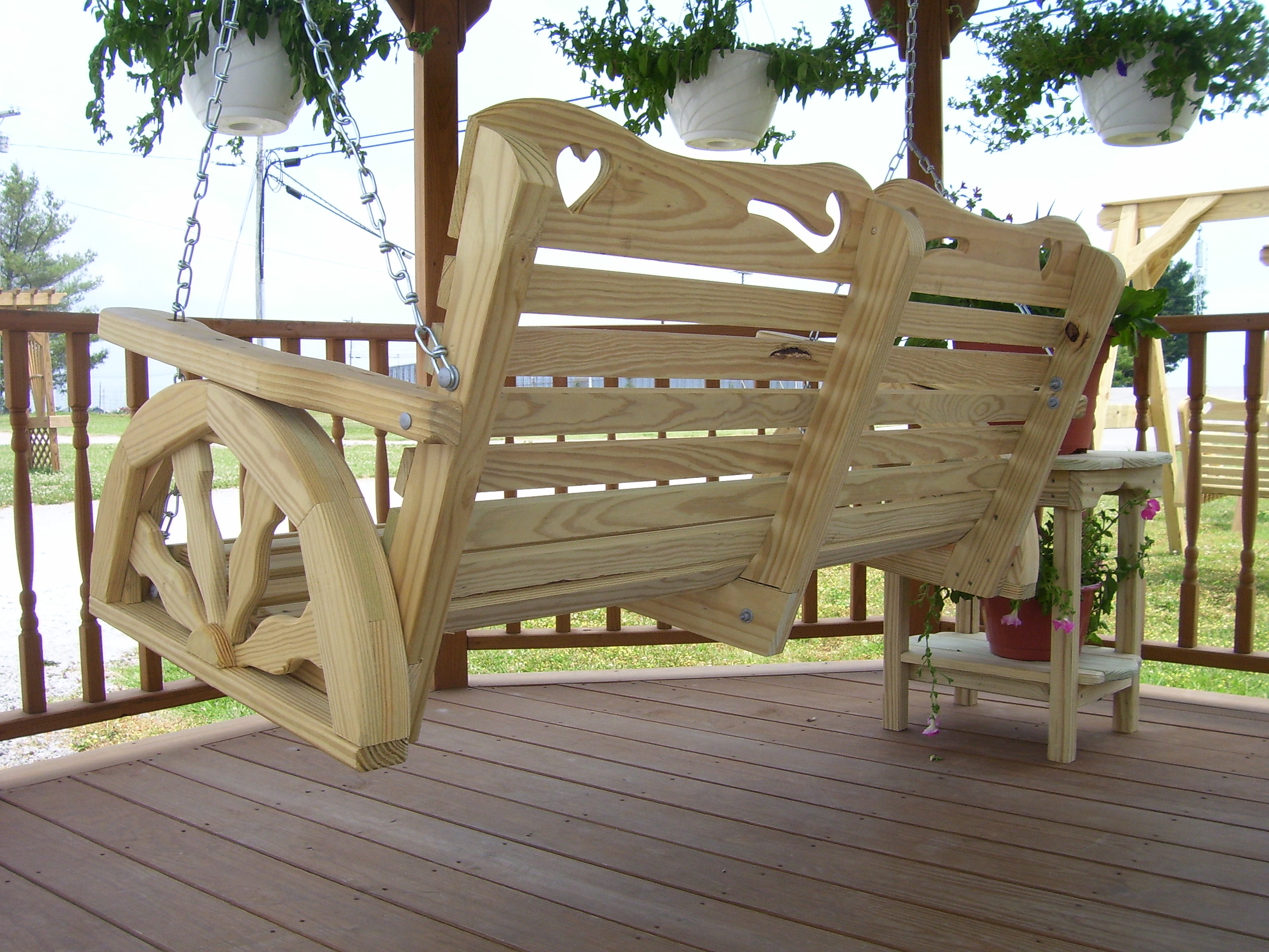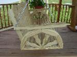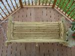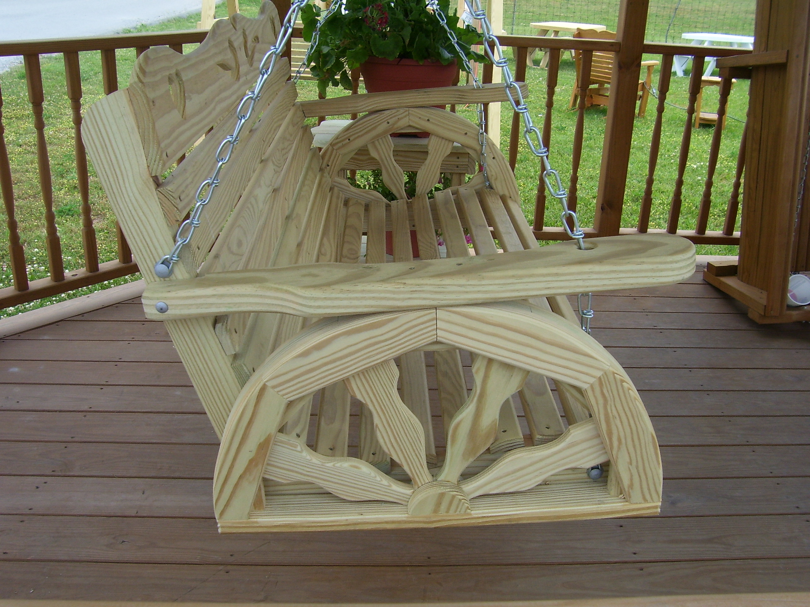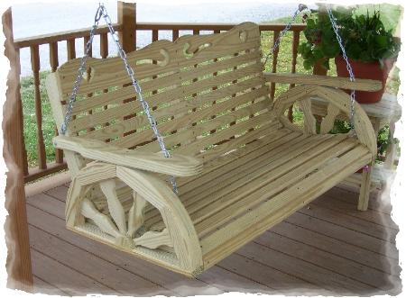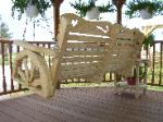The unique wagon wheel sides of the Conestoga swing takes the rider to a simpler time. The swing is made of #1 grade "Smart Sense" brand, pressure treated lumber. The lighter color lends itself to beautiful rich tones if stained. It is available in 2', 4', 5' or 6' widths. Custom sizes available as well. All screws and bolts are coated for use with pressure treated lumber. Heavy duty chains are included. All edges are routered for safety and comfort.